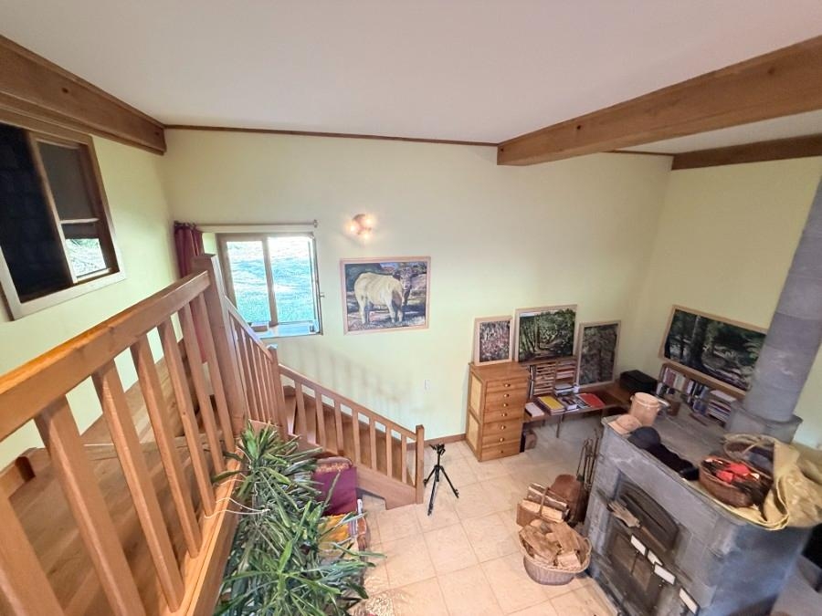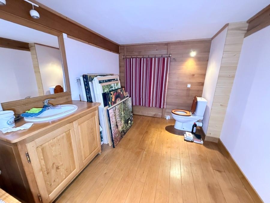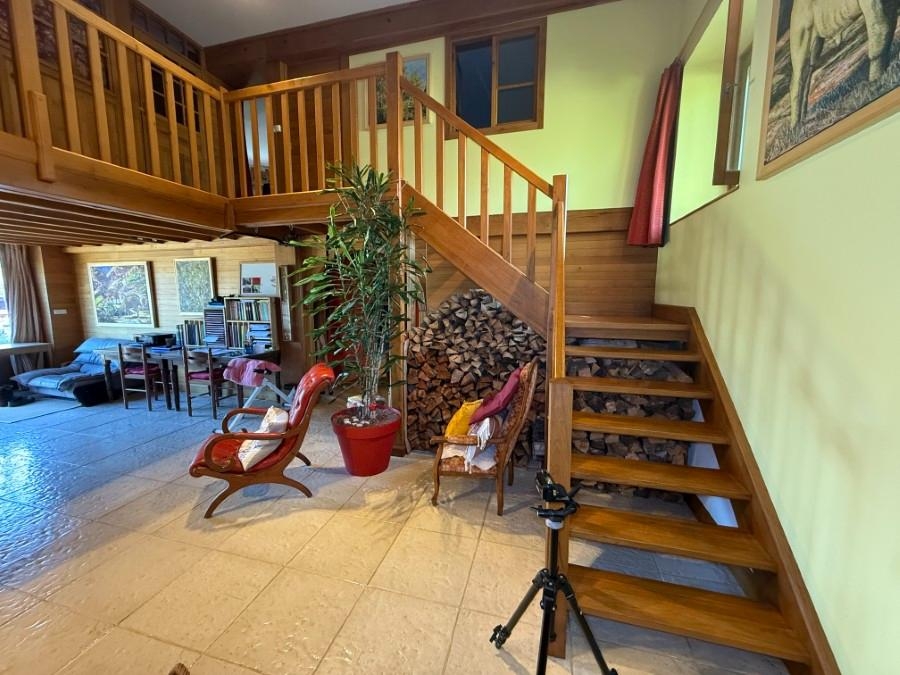 A l'étage : mezzanine permettant d'accéder à une chambre avec placards de rangement intégrés, bureau, bibliothèque, salle d'eau, grenier aménageable