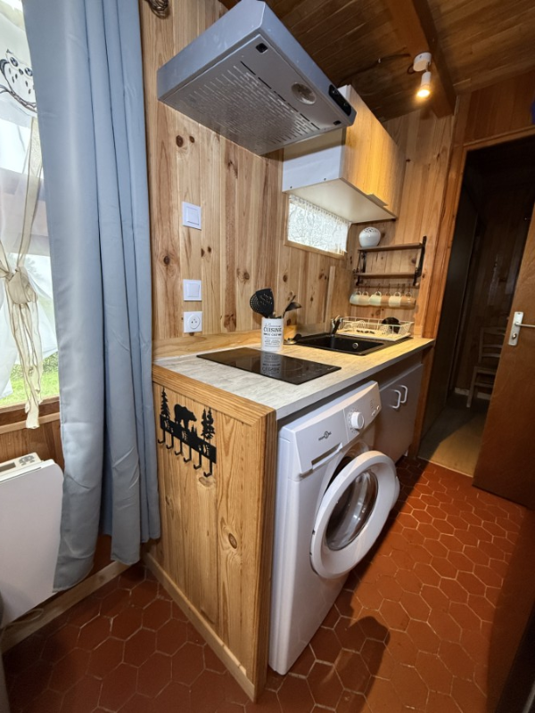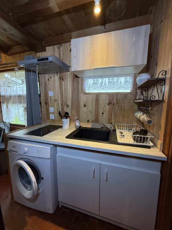 Ce chalet se compose en rez-de-chaussée d'une pièce de vie avec cheminée insert ouverte sur un coin cuisine, une salle d'eau avec douche et WC, 1 chambre avec placards de rangement