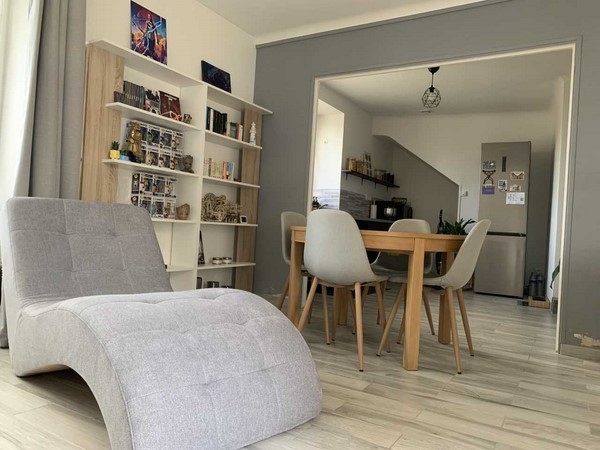 Au rez-de-chaussée, vous découvrirez une pièce de vie lumineuse et chaleureuse, avec cuisine aménagée et équipée, offrant un espace convivial et fonctionnel.